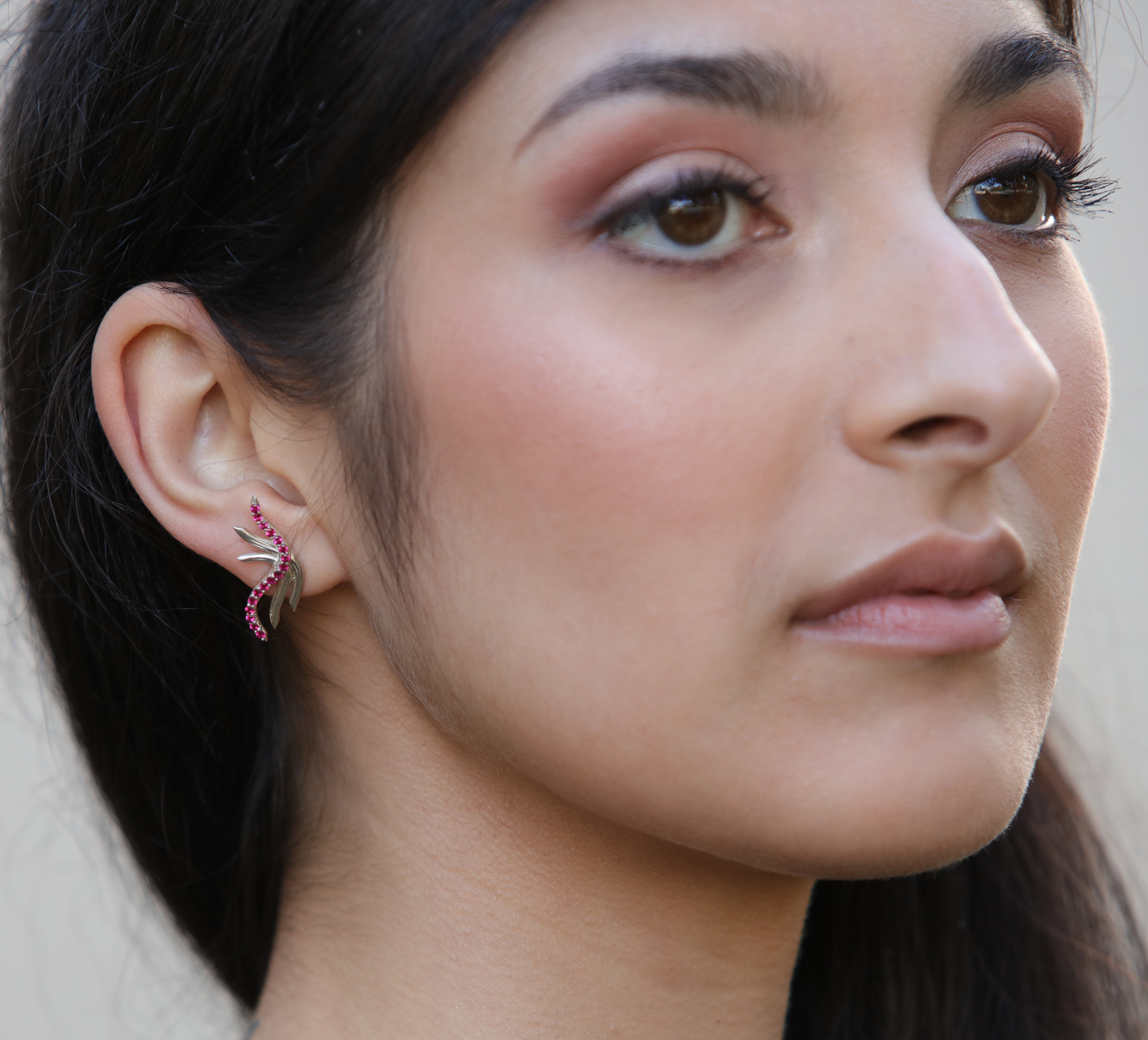 These Ethereal sterling silver earrings awaken with vibrant lab-grown rubies. Each gem, a spark of captured fire, dances with your every gesture. The rubies don't merely catch light; they gather it, transform it, and release it as pure radiance.