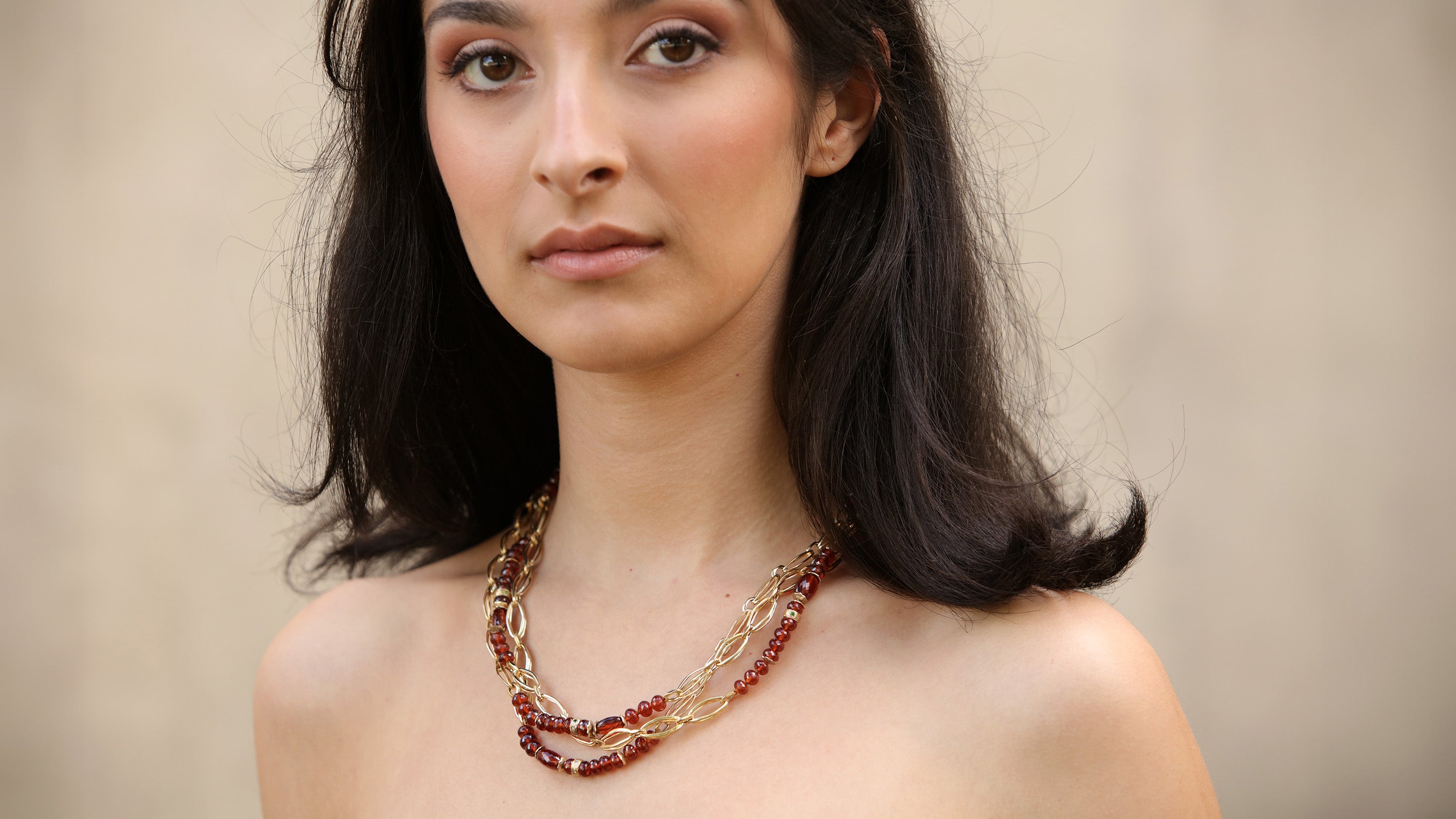 This three-strand necklace carries a quiet confidence, the kind that doesn't need to announce itself but somehow draws people in. Warm spessartite and vibrant tsavorite, both from the garnet family, find their natural harmony here, creating something that feels both unexpected and perfectly right.